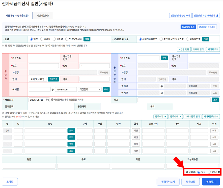 | 영수 | 거래 대금을 이미 받은 경우 | 거래 완료 및 결제 증빙용 세금계산서 발행 |